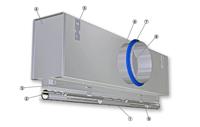 A damper blade (optional) simplifies volume flow rate balancing for commissioning.
